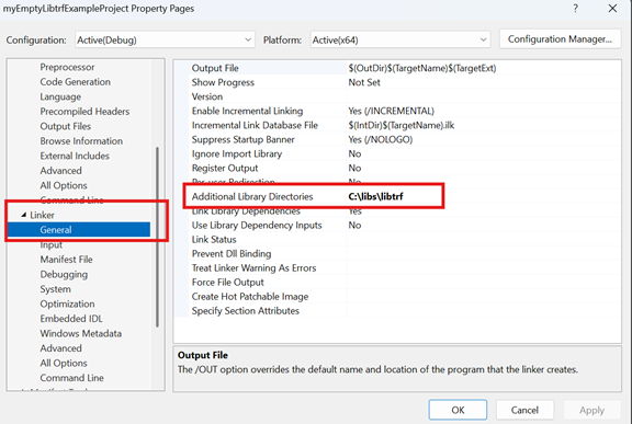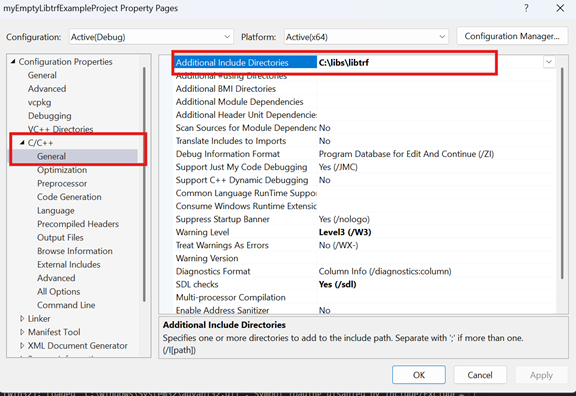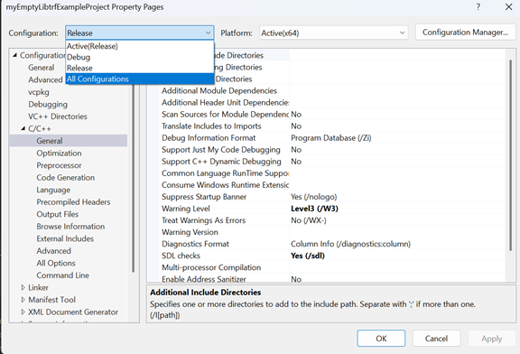 - If you change the configuration from Debug to Release must reconfigure properties or switch to All Configurations in properties when applying the settings